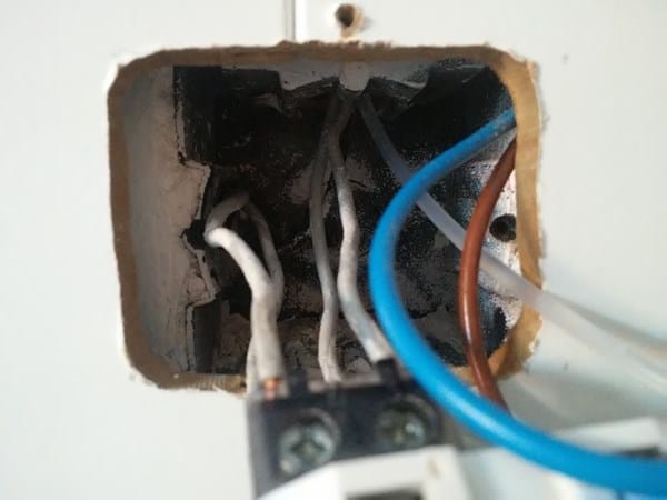 Segundo, el neutro (azul) no hay que llevarlo a la caja de interruptores/conmutadores, tienes que llevarlo directamente desde la caja de derivación a cada aplique respectivo, embornando todos los azules en su regleta/borna. Lo que sí hay que llevar a las dos cajas de mecanismos, desde la caja de derivación, es un cable que lleve la fase (cable marrón o negro) que embornarias con los otros cables negros, y otro cable (yo suelo usar blanco) que será el retorno que irá desde el interruptor al respectivo aplique, pasando por dicha caja de derivación. Así, a cada cada caja de mecanismos deberían llegar finalmente dos cables nuevos, uno negro (marrón) y otro blanco y, a cada aplique, debería de llegarle finalmente uno blanco y otro azul (siendo rigurosos y cumpliendo el reglamento debería de llegarle también a cada aplique un cable verde-amarillo desde la caja de derivación)