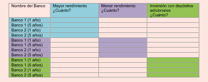 - Identifica dos bancos que te ofrecen el rendimiento más alto si lo inviertes a uno y a cinco años.