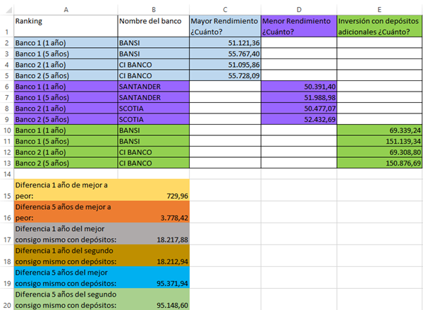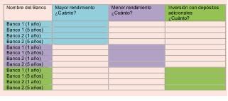 - Identifica dos bancos que te ofrecen el rendimiento más alto si lo inviertes a uno y a cinco años.