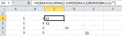 Si A4 hay 1 2 3 4 5 6 7 8 9 0 =EXTRAE(A4,1,1)&EXTRAE(B4,1,1)