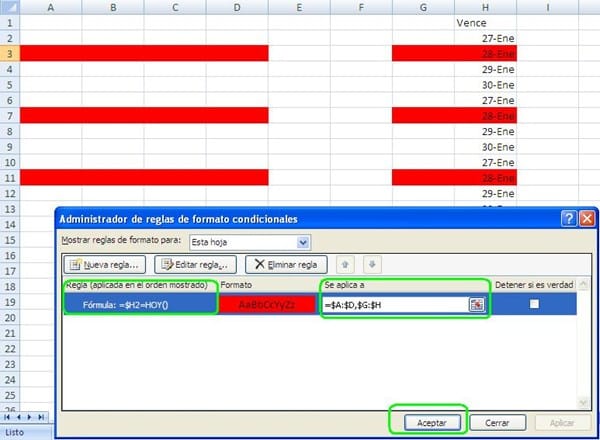 Quiero que las celdas cambien a color rojo (excepto la celda 5 actividad y la celda 6 nota) cuando coincida la fecha de vencimiento (celda 8vence) con la fecha actual; conozco el uso de la función formato condicional pero no logro dar con la fórmula