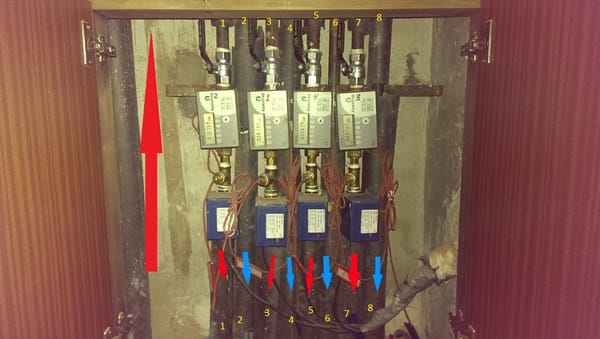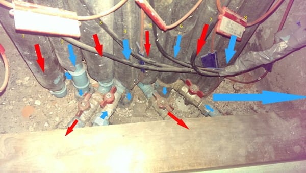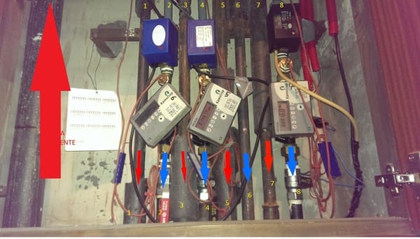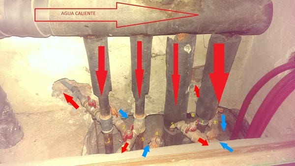 Mi consulta es: He ido viendo como van colocadas la tuberías y he llegado a la conclusión de que la instalación esta hecha como pongo en la imagen que hecho. (He hecho el esquema para cuatro pisos, dos en la primera planta y dos de la segunda planta, para que os hagáis a la idea de lo que he visto, falta de dibujar los otros cuatro pisos pero todos están conectados la misma línea de distribución, siguiendo el mismo diseño de distribución).