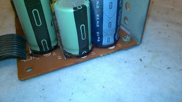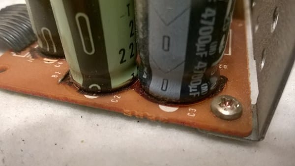 Querría saber si la sustancia marrón que aparece en la base de los condensadores de las fotografías es fuga del condensador, o pegamento.