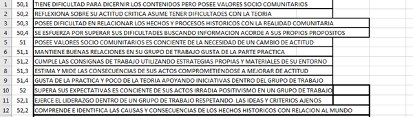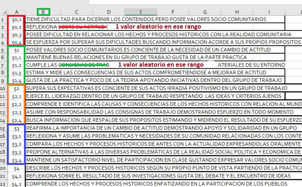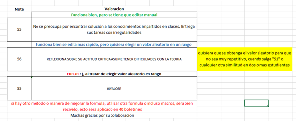 Tengo la siguiente formula, que me sirve para mostrar algunas frases de acuerdo a la nota, el uso es para boletines automatizados de estudiantes que le muestran su rendimiento cualitativo de acuerdo al cuantitativo, pero no logro hacerla funcionar me salen errores como " #¿Nombre?, #Valor, quisiera que me ayuden a optimizarla o encontrar tal vez otra forma para llegar al mismo resultado, con macros también podría ser.