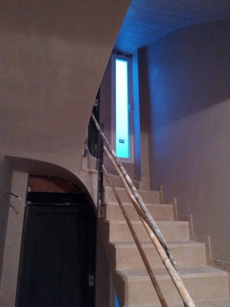Obra en la escalera, la cual han puesto ascensor, como la escalera es estrecha han puesto ventanas de 2m de alto por unos 40cm de ancho. Las han hecho abatibles hacia fuera la hoja entera. Los vecinos nos hemos quejado al arquitecto al abrir hacia fuera, primero porque cualquier niño que se asome se puede tirar, segundo que no se puede limpiar la ventana por fuera. La respuesta de ellos fue que se ha puesto conforme normativa y que dentro del patio pondrán una especie de barandilla (hasta la manivela) para que no se pueda tirar ningún niño.