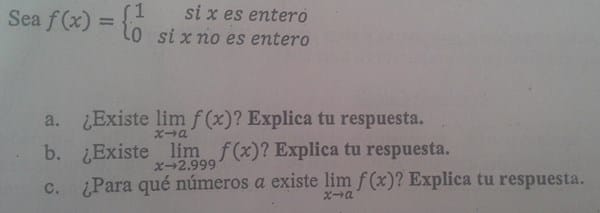 ¿Existe el límite x->a de f(x)=1 si x es entero, 0 si x no es entero?si, sípara qué valores x?Existe el límite x->2.999 de f(x)?