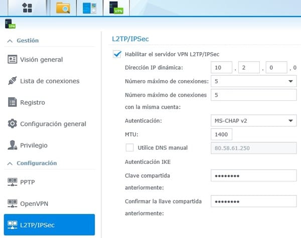 Tengo un NAS synology DS214 play, en el cual tengo una aplicación que hace de servidor de conexiones VPN, lo he configurado para el protocolo L2TP/IPSec como veis en la siguiente imagen: