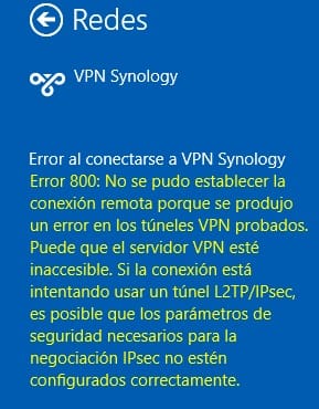 El caso es que desde el móvil no tengo problemas de conexión puedo acceder a la VPN sin problemas, pero cuando configuro la conexión VPN en el portátil me aparece el error 800 al intentar conectar, desde casa de mi hermano no me puedo conectar, y desde mi casa tampoco.