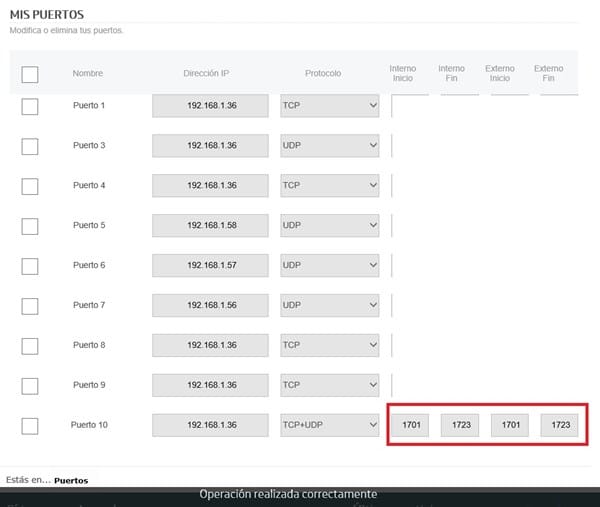 Hasta aquí todo bien, he abierto los puertos en el servidor conjuntamente con el router: