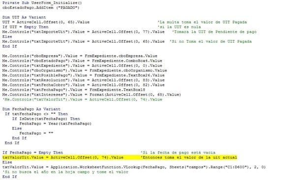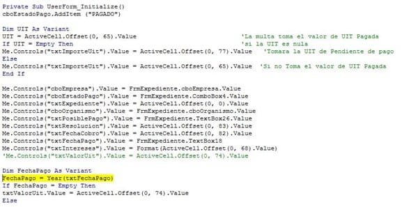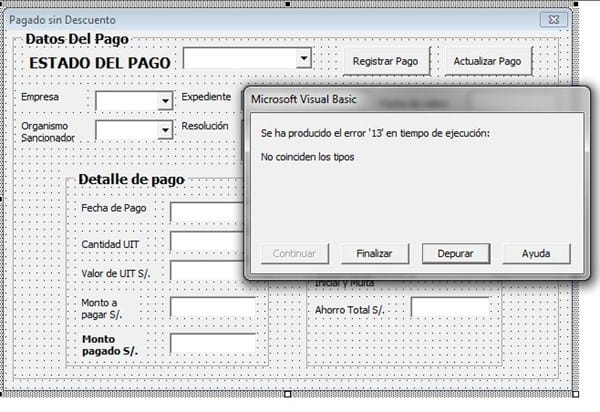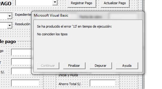 Tengo un problema en mi macro de Excel, lo que pasa es que cuando quiero registrar un pago y pongo la fecha de pago o la dejo en blanco me sale un error de tipo de datos, he intentado cambiar el dato de la variable de la fecha pero igual me sigue apareciendo el error, les adjunto la imagen en la linea que genera el error y el mensaje del mismo, desde ya muchas gracias por su tiempo y espero su ayuda.