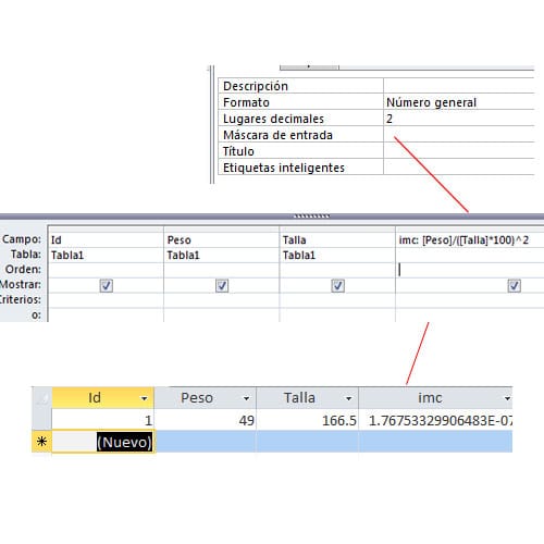 Ya he intentado con la opción Redondear: IMC: Redondear(Peso/(Talla*100)^2,2), pero sigue el resultado me tira 0, e igual he estado variando los formatos pero nada.