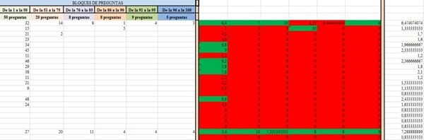 Le explico. Mi tabla "pepe antonio" contiene 300 alumnos. El examen son 100 preguntas, divididas en 6 bloques. El primer bloque contiene 50 preguntas, el 2 25... Y el último Historia 5. Por ello, Pepe de 50 preguntas acierta 32. Su resultado es un 6,4 que quisiera que apareciese en verde negrita, pero no el fondo, si no el 6,4. Sin embargo Pepe en Historia sólo ha acertado 1 pregunta, por ello obtiene un 2 rojo, que por estar suspenso si me gustaría que apareciese en negrita con fondo rojo.
