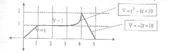 $$\begin{align}&\text{Sabemos que x'(t) = v(t), luego x(t) = }\int v(t) dt \text{ (haciendo abuso de notación)}\\&\text{Ahora tenemos que calcular x(t) en cada uno de los tramos}\\&Entre \ 0 \ y \ 1:\\&x(t) = \int_0^1 t \ dt = \frac{t^2}{2}\bigg|_0^1 = \frac{1}{2}\\&Entre \ 1 \ y \ 3:\\&x(t) = \int_1^3 dt = t\bigg|_1^3 = 3-1=2\\&Entre \ 3 \ y \ 4:\\&x(t) = \int_3^4 (t^2-6t+10) dt = (\frac{t^3}{3}-3t^2+10t)\bigg|_3^4 = (\frac{64}{3}-48+40)-(9-27+30)=\frac{4}{3}\\&Entre \ 4 \ y \ 5:\\&x(t) = \int_4^5 (-2t+10) dt = (-t^2+10t)\bigg|_4^5 = (-25+50)-(-16+40)=1\end{align}$$