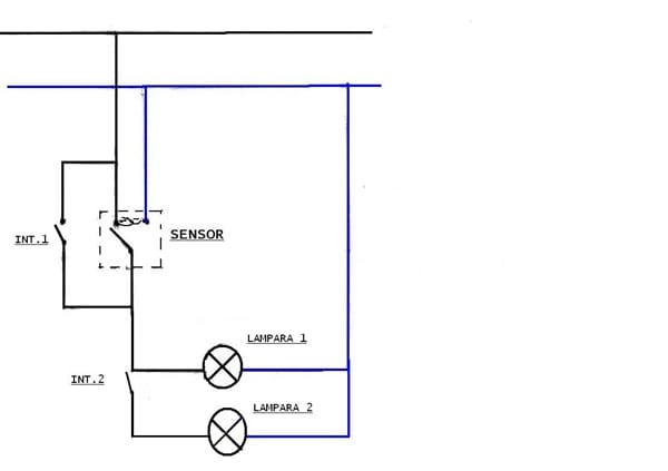 Quiero poner dos lámparas en el garaje con sensor de presencia para que se enciendan las dos cuando entro con el coche y un interruptor para cada una por si voy de día al garaje, poder encender una o las dos. ¿Alguien puede hacerme un esquema? Mi correo es:[email protected] .