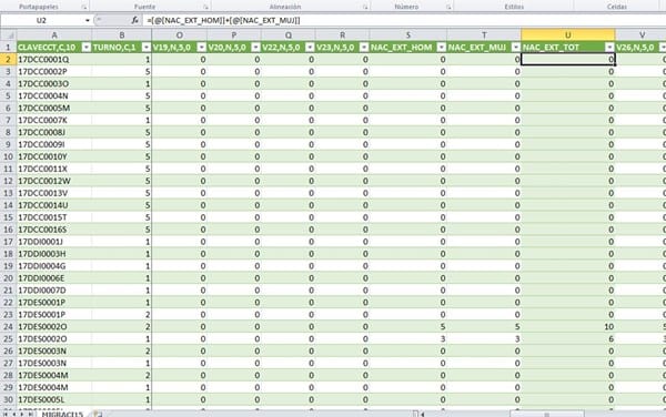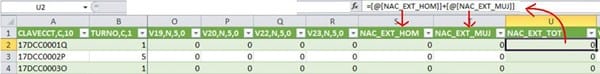 Me han pasado una tabla de excel, pero los encabezados de las columnas tienen nombre de celdas + ",". Ejemplo:" V67,N,5,0". En los totales insertan una fórmula así: =[@[HOM]]+[@[MUJ]]