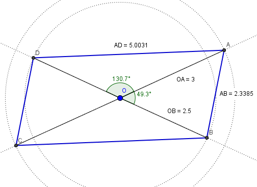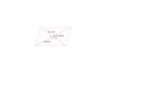 Las diagonales de un paralelogramo miden 5 cm y 6 cm; y se cortan formando un ángulo de 49.3º.Hallar las longitudes “a” y “b” de los lados del paralelogramo.