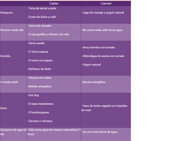 Tanto Carlos como Carmen han seguido una dieta muy poco variada durante los últimos 10 años, generalmente en un día común sus alimentos son: