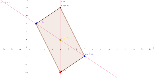 Los puntos A(1,3) B(4,5) C(7,-1) son vértices de paralelogramo ABCD hallar coordenada DE y ecuaciones diagonales y punto medio del paralelogramo