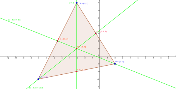Dado los puntos A(-3,7) B(2,-1)yC(-8,-3) calcular las tres medianas y bario entro. Demostrar que es doble la distancia deA al bario entro que la distancia con punto medio del segmentoBC