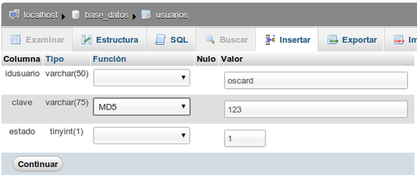 Ahora, damos clic al botón “Insertar” para poder insertar un registro de prueba, y colocamos los nuevos valores (ver la imagen para mayor referencia) y finalmente damos clic en “Continuar”.