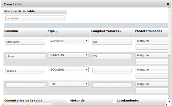 Ahora, colocamos el nombre de nuestros campos, el tipo de datos, la longitud y, en el caso del campo idusuario, le diremos que será llave primaria. Ver la siguiente imagen para mayor referencia.