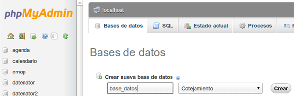 mysql_close($link); ?>Como podemos apreciar del código (muy sencillo por cierto) hacemos una validación de la información ingresada por el usuario (usuario y contraseña) contra la información que están en la base de datos, para así finalmente, si todo esta bien, se direcciona a la aplicación principal; sino, muestra un mensaje de alerta indicando el problema. Ahora, no hemos hablado de la base de datos, por lo que a continuación realizaremos la creación de la misma y crearemos la tabla de usuarios (sencilla). Lo primero, es entrar a PHPMyAdmin así: http://localhost/phpmyadmin Nos autenticamos con nuestro usuario y contraseña y, una vez adentro, se da clic en “Base de Datos” para luego agregar el nombre de nuestra base de datos y damos clic en Crear.