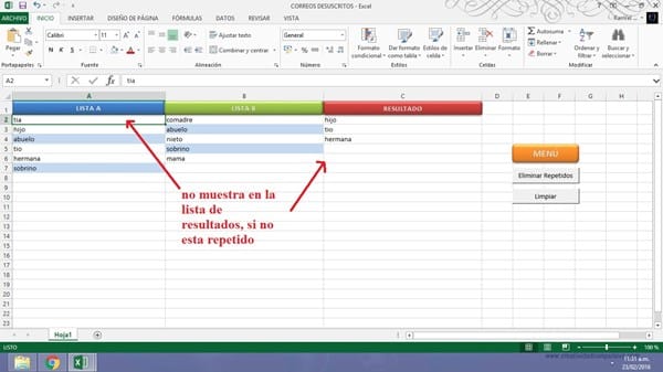 Según tu ejemplo de la pantalla. Tía que se encuentra en la cela A2, no existe en la columna B, por lo tanto, se tiene que pasar a la columna C.