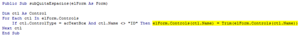 Public Sub subQuitaEspacios(elForm As Form) Dim ctl As Control For Each ctl In elForm.Controls If ctl.ControlType = acTextBox And ctl.Name <> "IDLIBRO" Then elForm.Controls(ctl.Name) = Trim(elForm.Controls(ctl.Name)) Next ctl End Sub