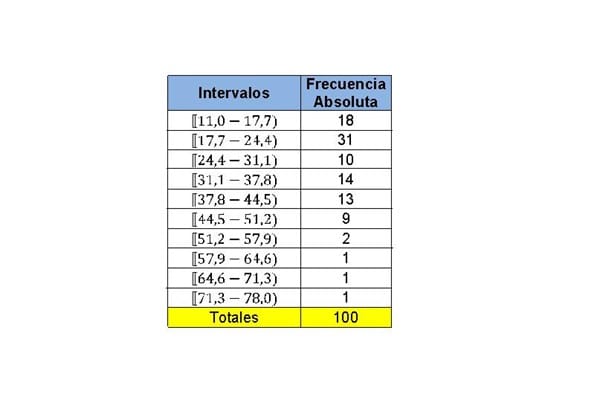 - Frecuencia Absoluta: Escribe la frecuencia absoluta de cada intervalo