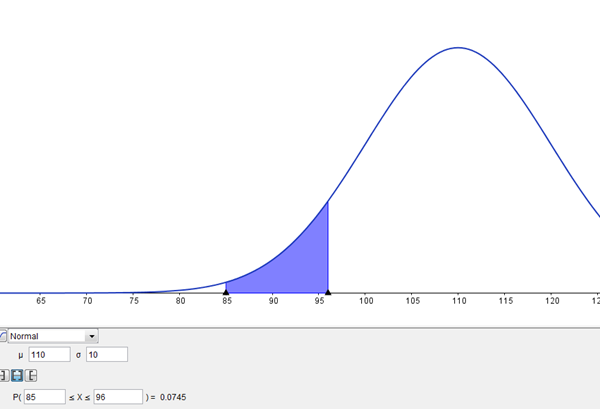 2. La talla de los niños entres los cuatro y seis años que componen la población del programa de crecimiento y desarrollo de un hospital, tienen una distribución normal con una media de 110 cm y una desviación estándar de 10 cm. Calcular la probabilidad de elegir un niño al azar con talla entre 85 cm y 96 cm.