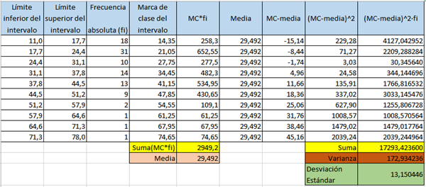 Con las explicaciones que me dio el Prof: valero pude entender muy bien como se hace el ejercicio, es un tanto laborioso sobre todo en excel, lo que no entiendo es Qué interpretación le daría a la desviación estándar en términos del problema.