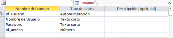 Los campo de cuadro combinados son los campo clave de las tablas con la información, es decir el Id_usuario me devuelve el Nombre de Usuario de la tabla usuario donde los campos Id_usuario es autonumérico y Nombre de Usuario es Texto. El Id de cliente es autonumérico y Nombre Cliente es Texto. Así con los otros campo de cuadro combinados.