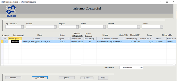 Tengo una tabla para llevar información de propuestas o cotizaciones emitidas del Dpto Comercial, ya tengo las tablas, consultas y algunos formularios para la introducción de la información y algunos reportes también. Desea elaborar un formulario con varios campos combos combinados (que ya lo tengo) que me sirvan para filtrar la información a mostrar bien sea en otro formulario o un reporte. Los Combos Combinados son los campos Usuario, Cliente, Región, Situación de la propuesta, Sistema y Motivo. El Formulario o reporte debe ser filtrado por uno o varios campos para mostrar la información a través de un botón de Vista Previa o Imprimir en el formulario principal.