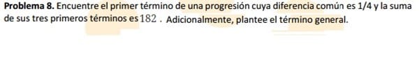 $$\begin{align}&s_n=\frac{n(a_1+a_n)}{2}\\&\\&s_3= \frac{3(a_1+a_3)}{2}\\&\\&\text{el término general es}\\&\\&a_n= a_1+(n-1)d\\&\\&a_3=a_1+2d\\&\\&\text{luego}\\&\\&s_3= \frac{3(a_1+a_1+2d)}{2}\\&\\&s_3=\frac{3(2a_1+2d)}{2}\\&\\&s_3=3(a_1+d)\\&\\&a_1+d=\frac{s_3}{3}\\&\\&a_1=\frac{s_3}{3}-d\\&\\&a_1=\frac{182}{3}-\frac 14= \frac{4·182-3}{12}=\frac{725}{12}\\&\\&---------------\\&\\&\text{Vamos a asegurarnos}\\&\\&\frac{725+728+731}{12}=182\\&\\&\text {Está bien}\\&\\&\text{Y el término general será}\\&\\&a_n=\frac{725}{12}+(n-1)\frac 14\\&\\&a_n=\frac{722}{12}+\frac n4\\&\\&a_n= \frac{361}{6}+\frac n4\end{align}$$: