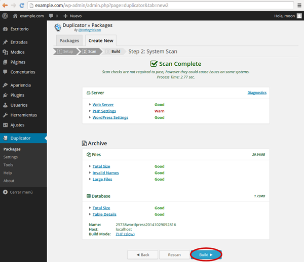 El plugin escanea toda la instalación de WordPress para ver si es posible realizar la exportación. En este punto es normal que nos indique que PHP Settings tiene un Warn en rojo debido a que la directiva open_basedir en CDmon se encuentra establecida por defecto y no es posible modificarla por motivos de seguridad. La mayoría de web pequeñas con un tiempo de ejecución (max_execution_time) de 30 es suficiente, pero si por algún motivo no funciona o queremos asegurarnos siempre podemos aumentar el valor PHP excepcionalmente. Pulsamos sobre la opción "Build":