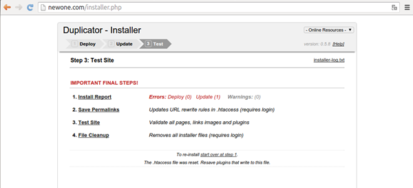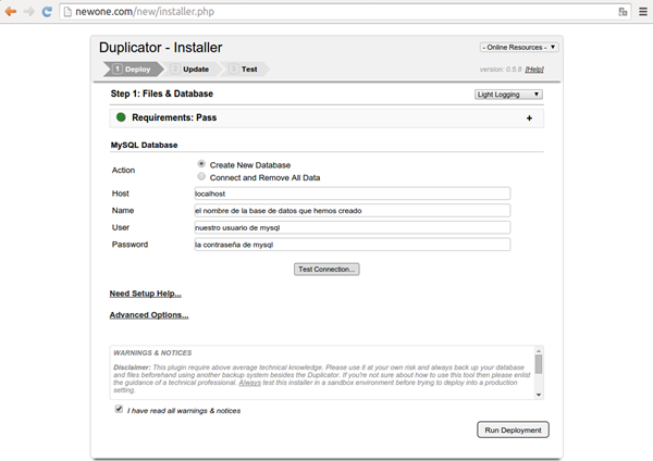 Una vez iniciamos el instalador de Duplicator en el nuevo sitio debemos tener en cuenta varios puntos: