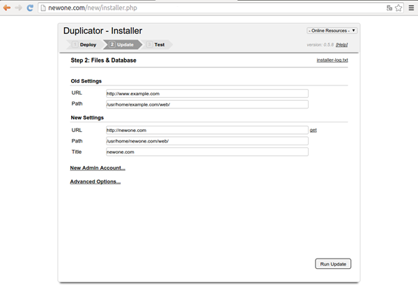 Una vez tenemos todo completo, pulsamos sobre el botón "Run Deployment" para pasar a la siguiente pantalla donde automáticamente nos coge todos los datos de las rutas antiguas y la ruta nueva. En este punto no debemos tocar nada normalmente (podemos modificar los datos del usuario Admin por unos nuevos en "New Admin Account..."). Para iniciar la actualización de las rutas pulsamos en "Run Update":