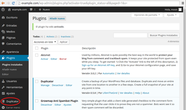 Al dirigirnos a la pantalla de plugins nos aparece un mensaje conforme "el plugin ha sido activado" y podemos visulizar el botón "Duplicator" al que debemos acceder para empezar con nuestra exportación: