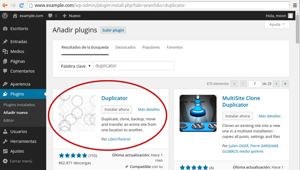 En la ventana de plugins debemos escribir en el cuadro en blanco el nombre del plugin "duplicator". Nos aparecerán varias opciones a instalar, debemos escoger la primera realizada por "LifeInTheGrid" y pulsar en el botón "Instalar ahora":
