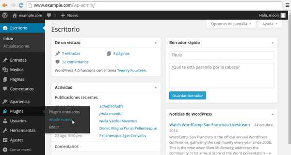 Para empezar debemos instalar el plugin desde el propio administrador de WordPress. Para ello accedemos a "Plugins" y pulsamos en "Añadir nuevo":