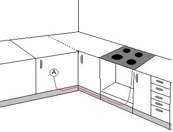 Por tanto, necesitamos poner la bombona en otro sitio. En ninguno de los armarios laterales cabe (son muy estrechos), por lo que solo me queda el armario A para ponerla. Había pensado en pasar el tubo por debajo del mueble, lo que tapa el rodapié, pero necesito un tubo muy largo y no sé si es posible hacerlo con un tubo naranja flexible.