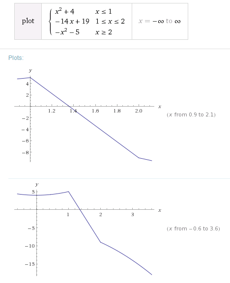 He intentado en wolfram con la opción de piecewiese, pero no me da el plot aunque se lo ordene ( plot piecewiese ...) he tratado con varias graficadoras, la intención es saber por medio de la gráfica si la función es continua, por otra parte, me gustaría que me ayudaran a solucionarlo para compararlo con el mio.