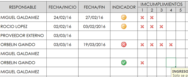 El esta hoja primer hoja coloco todas las personas que se les acciona un proceso para realizar tomare el ejemplo de Orbelin Galindo si vez tiene dos procesos iniciados y pero en las columnas de incumplimiento en el primero proceso tiene 4 X estas tiene un valor 1 pero por un formato condicional pone las X rojas, y en el segundo tiene 1 X, pero tengo una segunda hoja donde controlo los avances y incumplimientos.