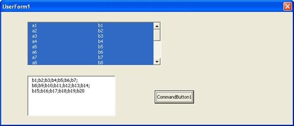 Private Sub CommandButton1_Click() On Error Resume Next TextBox2 = "" For X = 0 To ListBox1.ListCount - 1 ListBox1.Selected(X) = Not ListBox1.Selected(X) Next For X = 0 To ListBox1.ListCount - 1 If ListBox1.Selected(X) = True Then lista = lista & ";" & ListBox1.List(X, 1) End If Next lista = Mid(lista, 2, Len(lista) - 1) TextBox2.Value = lista End Sub