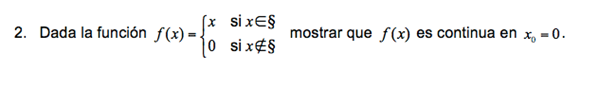 $$\begin{align}&\lim_{x\to 0}f(x) = f(0)\\&\\&\text{0 es racional }\implies f(0)=0\\&\\&\text{Luego hay que demostrar}\\&\\&\lim_{x \to 0}f(x)=0\\&\\&Dado\; \epsilon \gt 0 \text{ tomaré }\delta=\epsilon\\&\\&\text{entonces si }0\lt|x-0|\lt\delta\\&\\&\text {tendremos }\\&\\&\text{si x es racional}\\&|f(x)-0|=|x-0|\lt\delta=\epsilon\\&resumiendo\\&|f(x)-0|\lt \epsilon\\&\\&\text{y si x es irracional}\\&|f(x)-0|=|0-0|=0\lt \epsilon\\&resumiendo\\&|f(x)-0|\lt \epsilon\\&\\&\end{align}$$Luego |f(x)-0| < epsilon para todo x que cumple 0<|x-0|<delta