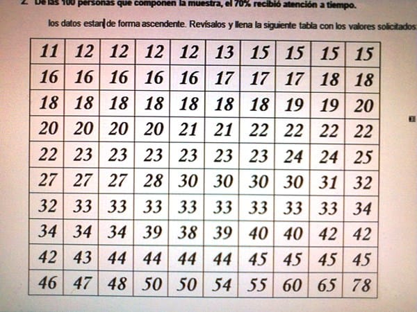 Los datos estan de forma ascendente. Revísalos y llena la siguiente tabla con los valores solicitados: