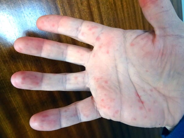 Puntitos rojos aparecen y desaparecen sobre todo en las palmas de las manos