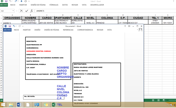 Lo que pretendo es que los datos del segundo recuadro que pertenecen al destinatario pueda llenarlos al seleccionar una casilla de la lista que contiene mi archivo de excel, o al hacer click en el segundo recuadro me muestre la lista de excel y asi seleccionar el destinatario que requiero y llene el formato de ante mano muchas gracias y linda noche :3
