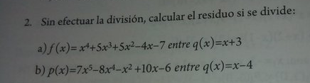 MatemáticasAsignaturas BásicasBachilleratos Juan Delgado el 10 mar. 16 ¿Como resolver estos ejercicios de calcular el residuo? Seguir Siguiendo Dejar de seguir 1 Respuesta Respuesta de Valero Angel Serrano Mercadal 1 1 Valero Angel Serrano Mercadal, Me voy x tiempo. Necesito hacer otras cosas, descansar y que... ··¡Hola Jesusgpe1!El residuo de un polinomio P(x) dividido entre un polinomio de la forma (x-r) es P(r)a) q(x) = x+3 luego r=-3P(-3) = (3)^4 + 5·(-3)^3 + 5·(-3)^2 - 4(-3) - 7 =81 + 5(-27) + 5·9 + 12 - 7 =81 - 135 + 45 + 12 - 7 = -4·b) q(x) = x-4 luego r=4P(4) = 7·4^5 - 8·4^4 - 4^2 + 10·4 - 6=7·1024 - 8·256 - 16 + 40 - 6 =7168 - 2048 - 16 + 40 - 6 = 5138·Y eso es todo, espero que te sirva.Saludos... el 11 mar. 16 - Anónimo ahora mismo Añadir comentario Usa los comentarios si quieres aportar algo a esta respuesta. No los utilices para preguntar algo nuevo. Cancelar Enviar