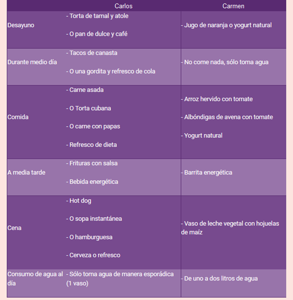 Tanto Carlos como Carmen han seguido una dieta muy poco variada durante los últimos 10 años, generalmente en un día común sus alimentos son: